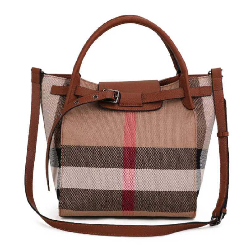 Wir präsentieren die Eléonore Handtasche – die perfekte Wahl für Frauen, die ein auffälliges und funktionales Accessoire suchen. Ihr klassisches Design mit einem Karomuster in neutralen Tönen und Akzenten aus echtem braunem Leder steht für Eleganz und Langlebigkeit.