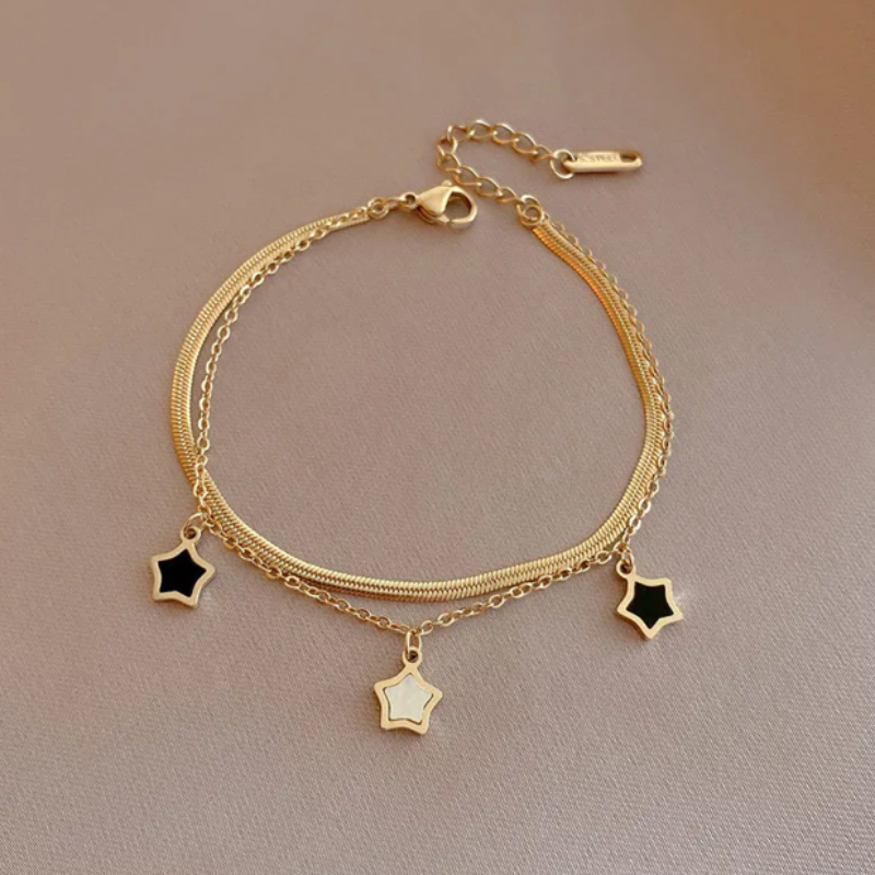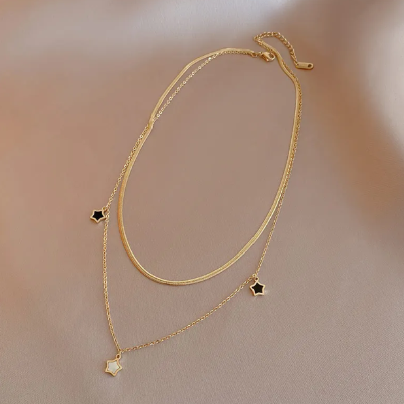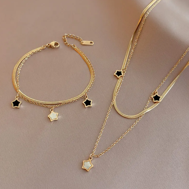 Das Emma Set vereint Charme und Raffinesse perfekt. Es besteht aus einer goldenen Halskette und einem Armband, beide verziert mit drei zarten sternförmigen Anhängern: zwei in Schwarz und einem in Weiß in der Mitte. Dieses moderne und minimalistische Design verwandelt jeden Look und verleiht ihm einen Hauch von Eleganz und zeitlosem Stil.
