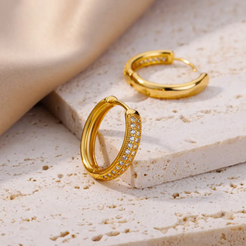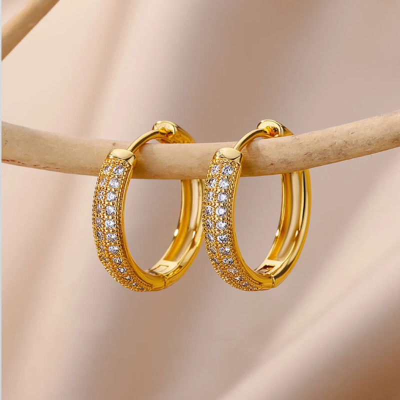 Kleine Creolen mit Zirkonia-Steinen, die Eleganz und Glanz ausstrahlen. Ihr rundes und zartes Design verleiht jedem Look Eleganz und macht sie ideal für alle Anlässe. Aus vergoldetem Edelstahl gefertigt, sind diese Ohrringe zeitlos und verleihen einen dezenten, aber dennoch auffälligen Hauch von Klasse.