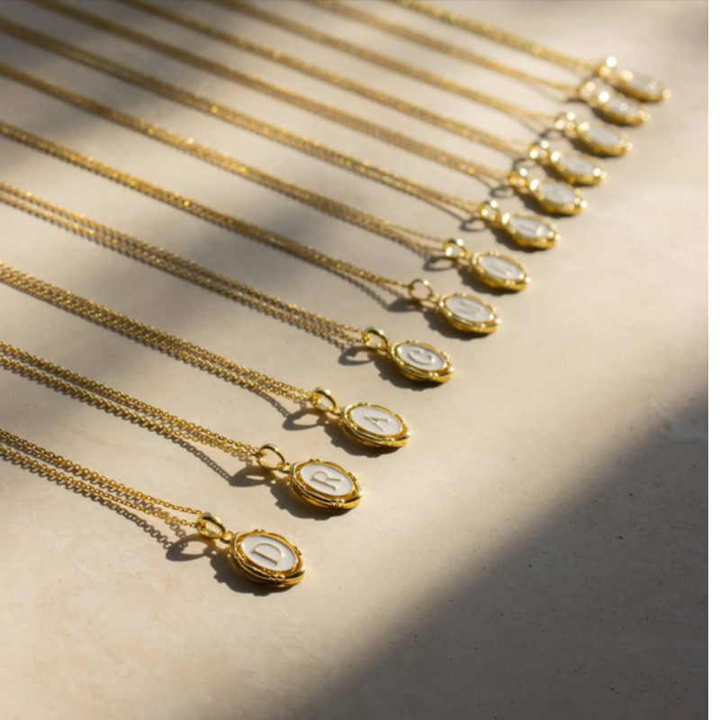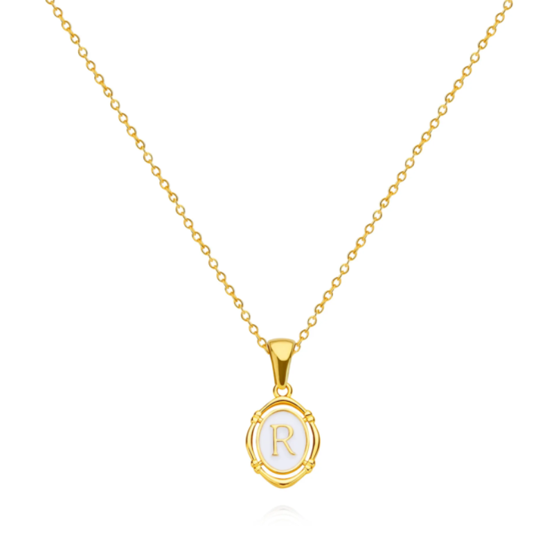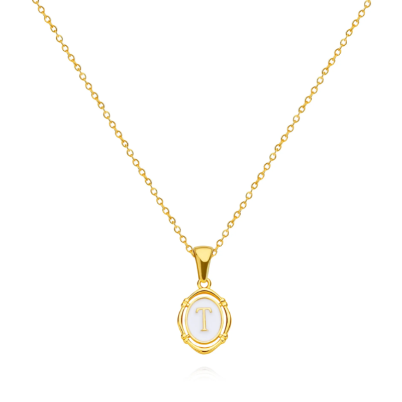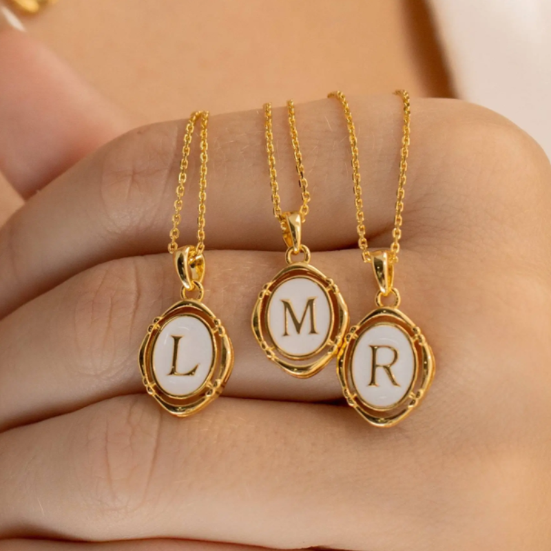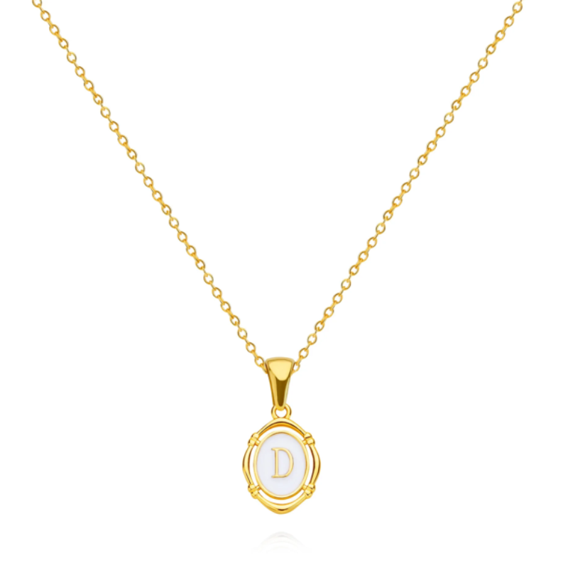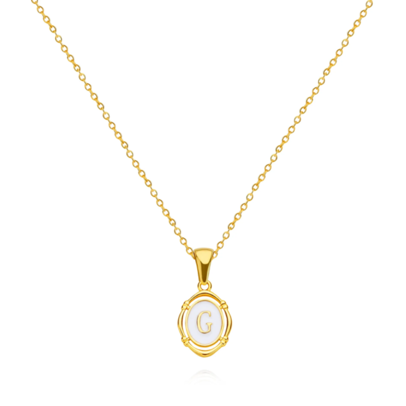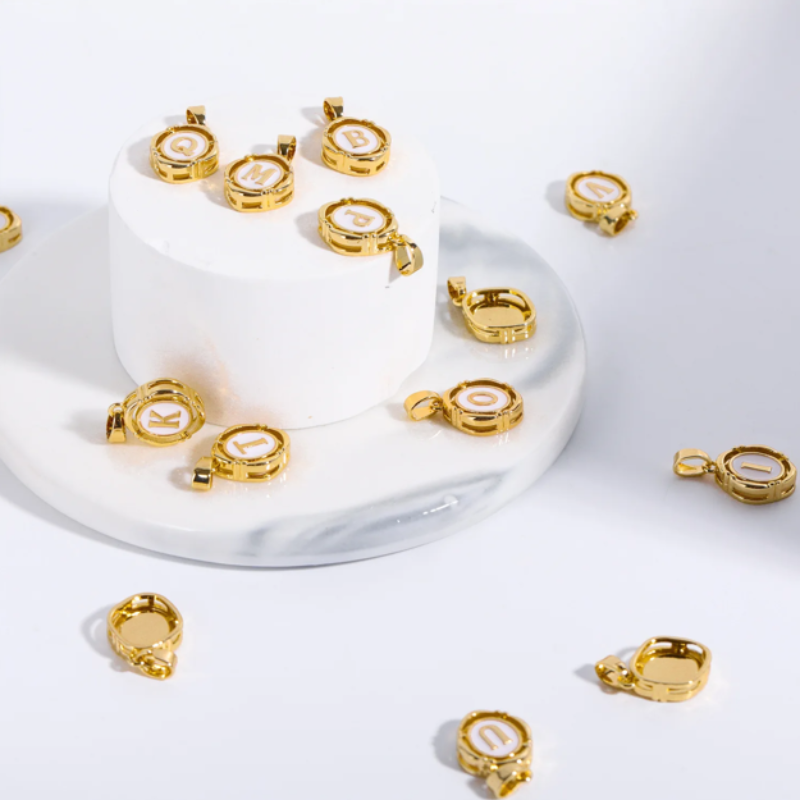 - Anhänger: Goldener Buchstabe mit weißem Emaille-Hintergrund.