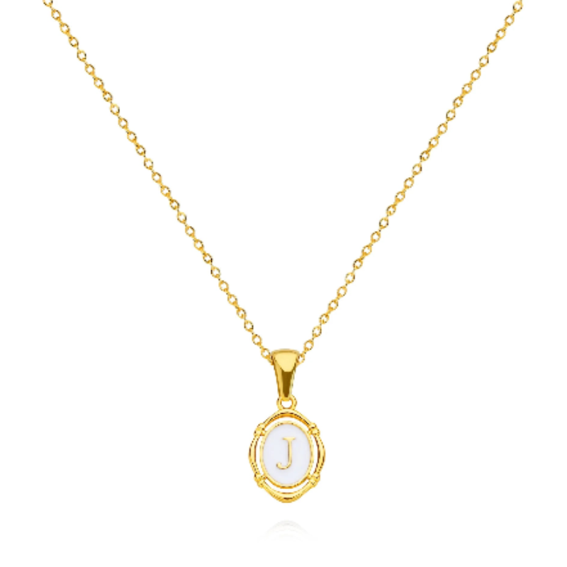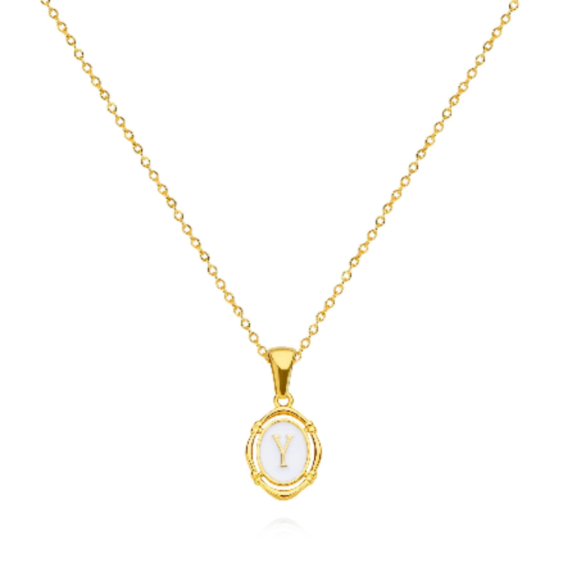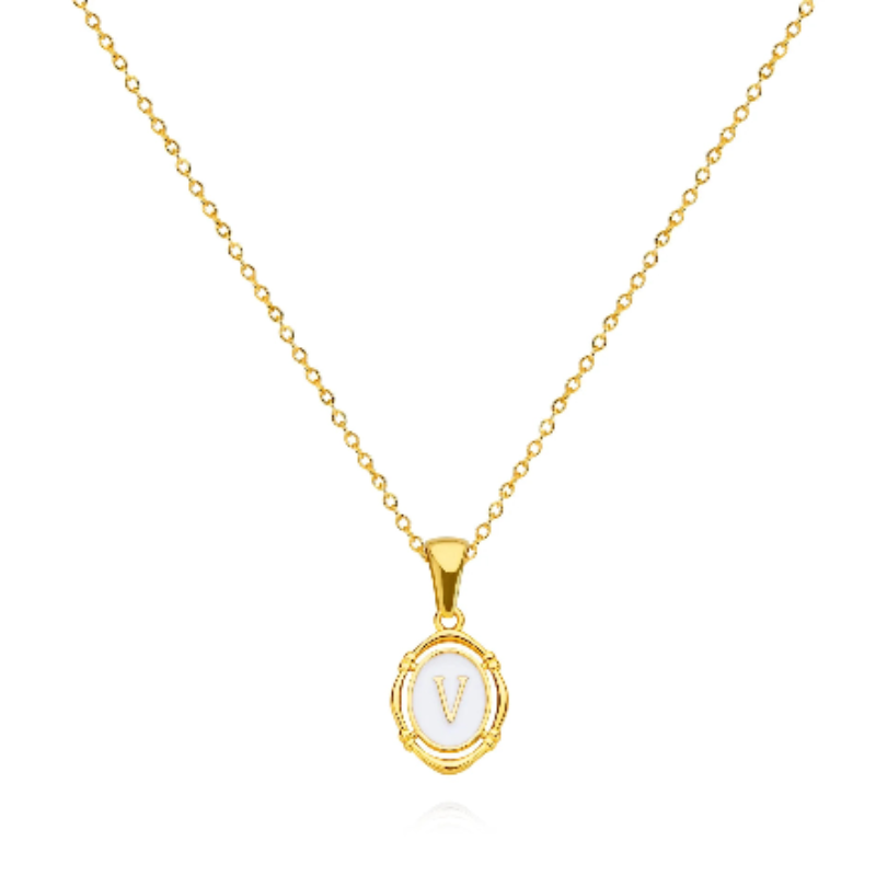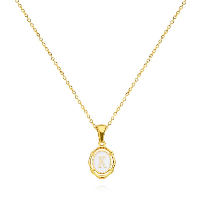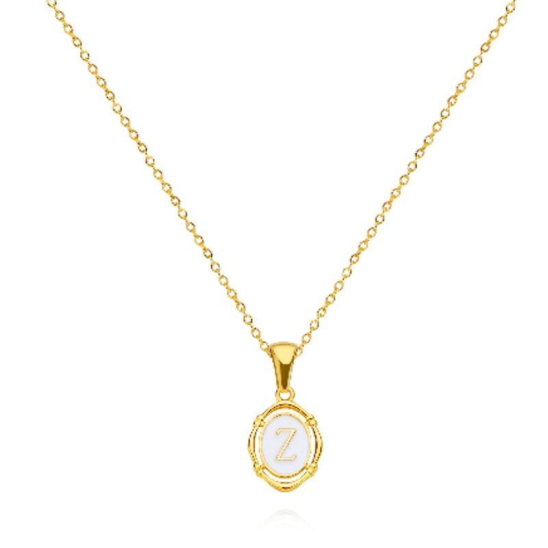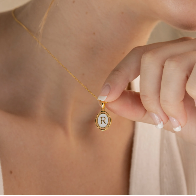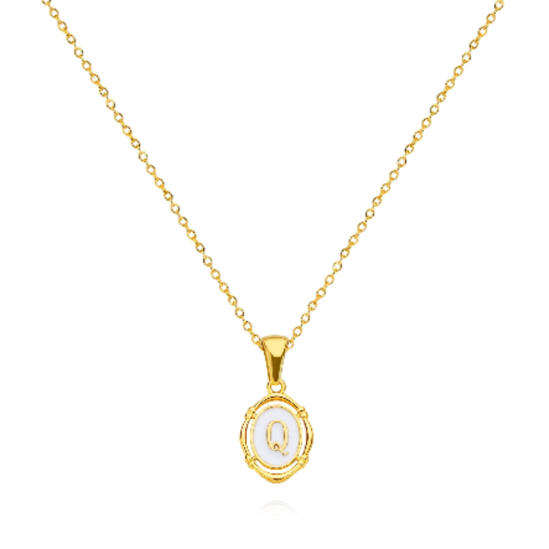 - Anhänger: Goldener Buchstabe mit weißem Emaille-Hintergrund.
